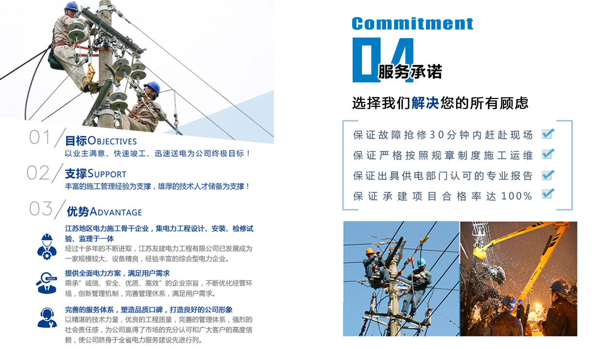 江蘇友建電力工程有限公司連續(xù)十余年被淮安市供電公司評(píng)選為合格入庫單位。目前承接著國網(wǎng)淮安供電公司核心區(qū)高低壓運(yùn)維搶修、淮安市區(qū)以及生態(tài)文旅區(qū)路燈變壓器維護(hù)、淮安市第一人民醫(yī)院高壓設(shè)備設(shè)施維護(hù);承接過江蘇省核心機(jī)房變電所高低壓配電值班、淮陰師范學(xué)院10KV配電系統(tǒng)調(diào)試保養(yǎng)、韓泰集團(tuán)110KV變壓所搶修試驗(yàn)等業(yè)務(wù),業(yè)主綜合評(píng)價(jià)優(yōu)良。公司以嚴(yán)密的組織機(jī)構(gòu)、嚴(yán)謹(jǐn)?shù)墓芾砝砟睢?yán)格的質(zhì)保體系,圓滿完成澳洋順昌35KV配電安裝工程、西游記龍宮大白鯨嬉水世界及漕埠商業(yè)中心10KV配電工程、上海國際花園受電工程、連云港新海科技創(chuàng)業(yè)城二期20KV配電工程、淮安悅榮府項(xiàng)目配電工程、碧桂園陽光湖畔小區(qū)居配工程.......